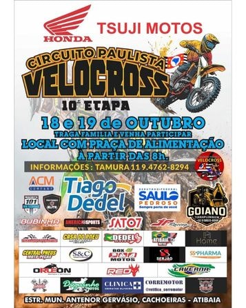 A 10ª etapa do Circuito Paulista de Velocross 2025 será realizada na cidade de Cachoeiras de Atibaia/SP, em um dos traçados mais tradicionais da região. Com apoio de grandes marcas e presença confirmada de diversos pilotos, o evento promete dois dias de muita emoção, velocidade e entretenimento para toda a família. A organização local está preparando uma estrutura completa, com praça de alimentação, arquibancadas e infraestrutura de apoio aos competidores.